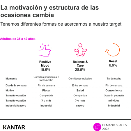 De hecho, el 50% del consumo llevado a cabo por los adultos de entre 35 a 49 años lo explican tres momentos muy distintos, determinados en función de las necesidades y emociones que existen detrás de sus rutinas, y que conforman las diferentes maneras que tienen las marcas de acercarse a su target. En Kantar han categorizado estas tres ocasiones como ‘Estado de ánimo positivo’ (15,6% de las ocasiones), más ligada a las comidas principales y a la tarde/noche del fin de semana, al placer y a compartir en grupo; ‘Equilibrio y cuidado’ (28,5%), vinculada a las comidas principales de entresemana, a lo saludable y a lo casero, compartiendo también con amigos; y, por último, ‘Restablecimiento’ (6,9%), vista como una ocasión individual en la tarde/noche del fin de semana y con la conveniencia como principal motivo.