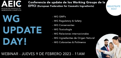 El pasado día 9 de febrero de 2023, la Asociación Española de Ingredientes Cosméticos (AEIC) celebró la primera conferencia en línea para socios. Se trata de un espacio, donde en colaboración con los miembros del grupo de trabajo de desarrollo técnico, se recopilan y tratan los temas más importantes de actualidad para el sector cosmético.
