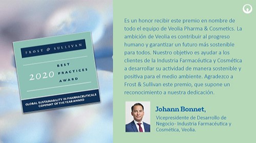 Johann Bonnet, vicepresidente de desarrollo de negocio para los mercados farmacéutico y cosmético en Veolia, ha declarado “es un honor recibir este premio en nombre de todo el equipo de Veolia Pharma & Cosmetics. La ambición de Veolia es contribuir al progreso humano y garantizar un futuro más sostenible para todos. Nuestro objetivo es ayudar a los clientes de la Industria Farmacéutica y Cosmética a desarrollar su actividad de manera sostenible y positiva para el medio ambiente. Agradezco a Frost & Sullivan este premio, que supone un reconocimiento a nuestra dedicación”.